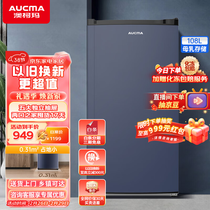 澳柯玛(AUCMA)108升立式冰柜家用冷冻冷柜 囤货母乳冷冻小冰柜一级能效以旧换新 BD-108NE价格:1049.00元!
