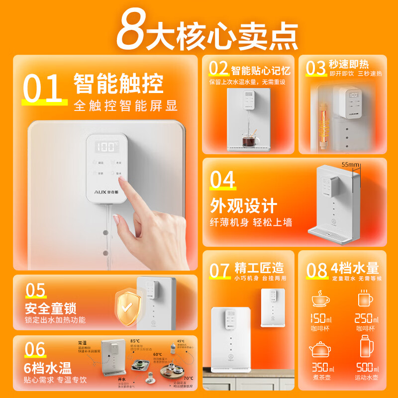 奥克斯(AUX)家用速热饮水机 台挂两用水量可调6档控温 净水器伴侣全通量适配 触控式壁挂管线机YGX-2204C价格:499.00元!