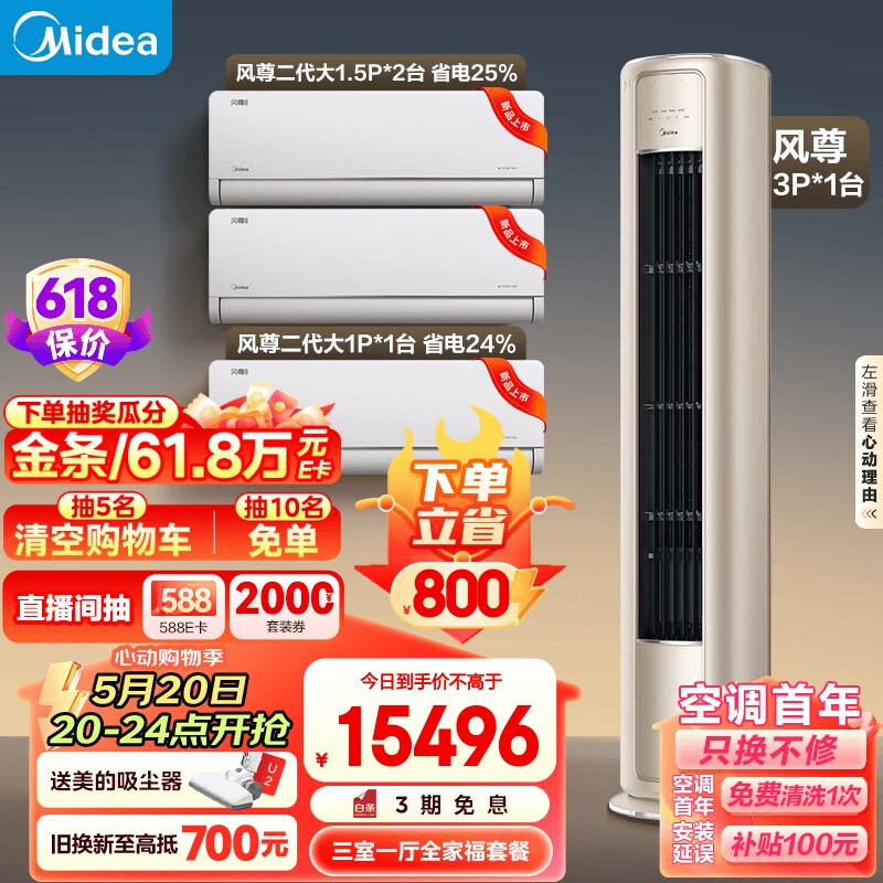 美的(Midea)空调 风尊系列 全家福套餐 三室一厅套装(大1.5匹风尊二代*2+大1匹风尊二代+3匹风尊柜机)价格:16296.00元!