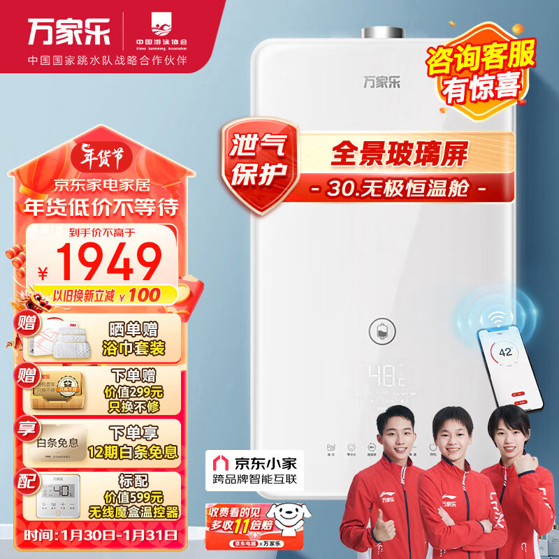 万家乐 16升防冻燃气热水器天然气无级恒温舱增压零冷水CO甲烷双安防京东小家智能三重净浴JSQ30-16RL5价格:1949.00元!