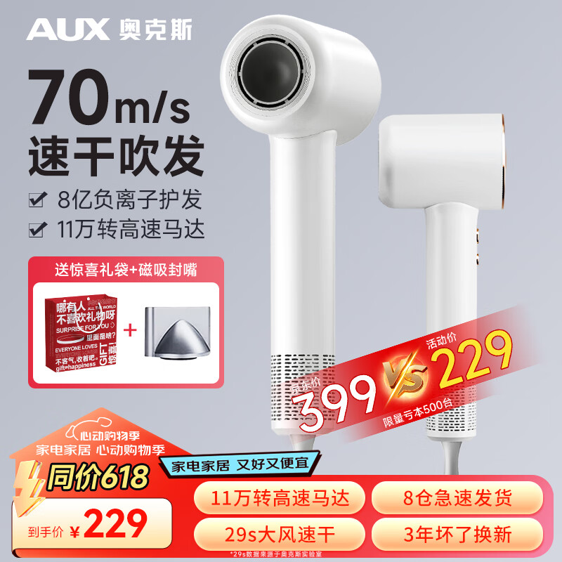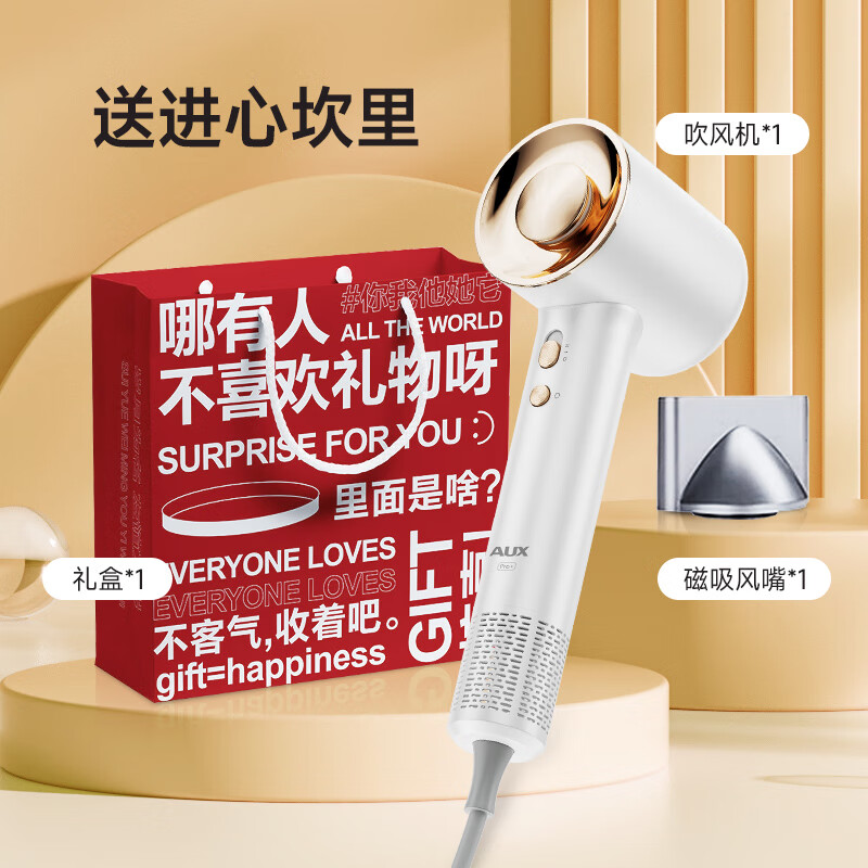 奥克斯(AUX)高速吹风机家用负离子护发吹风筒大功率速干无叶不伤发低音发廊电吹风 520节日送礼【惊喜礼袋装】价格:319.00元!