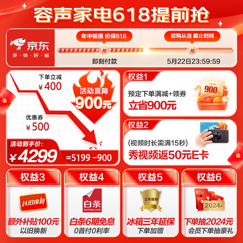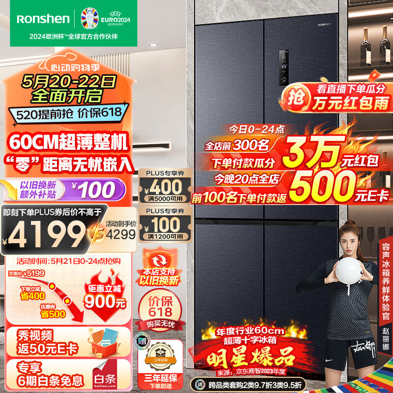 容声(Ronshen)60cm薄505升平嵌十字对开四开门超薄嵌入式冰箱家用变频一级能效底部散热BCD-505WD1FPQ超大容量价格:5198.00元!