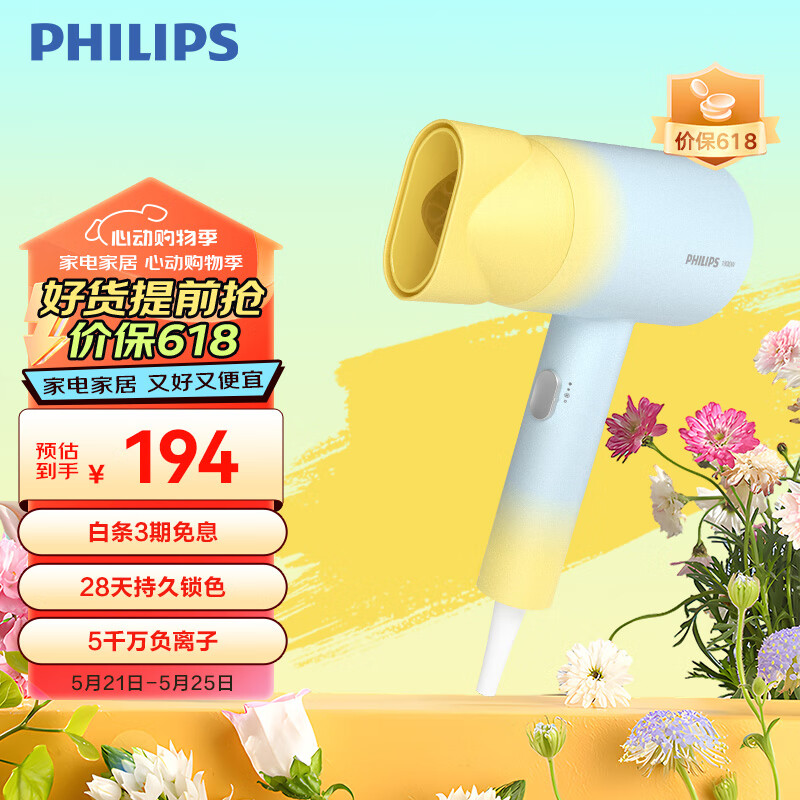 飞利浦(PHILIPS)电吹风机 3系炫色筒 锌离子防晒护色 5000万负离子 烫染修复 奶油黄价格:194.00元!