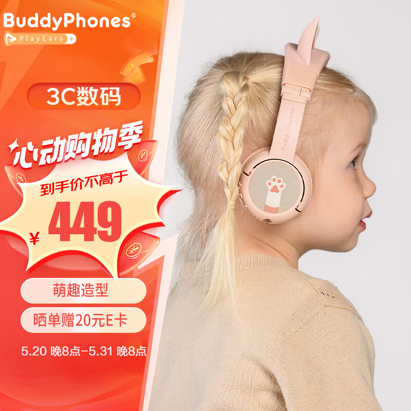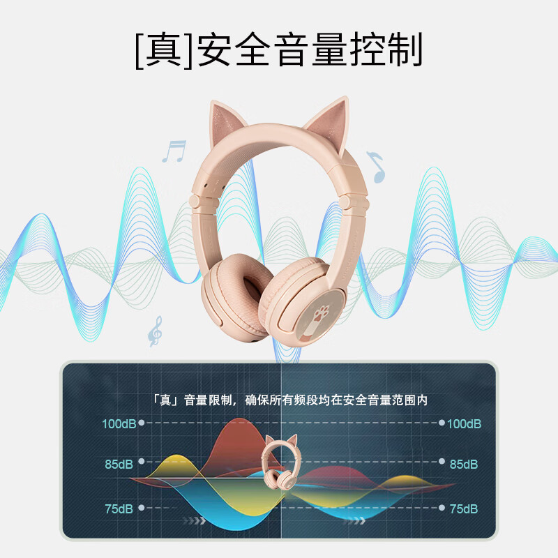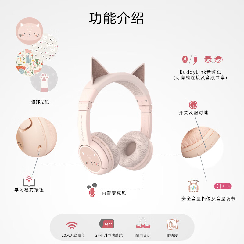 onanoff BuddyPhones儿童耳机萌趣耳朵头戴式 无线蓝牙学生网课学习 兼容苹果安卓系统 PlayEars+猫咪粉色价格:529.00元!