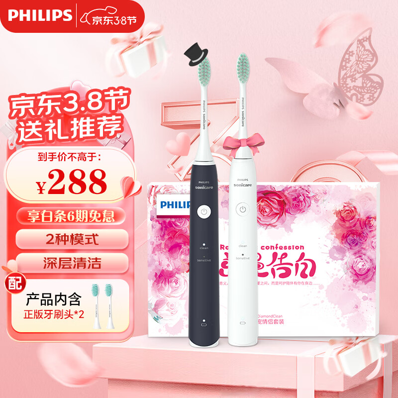 飞利浦(PHILIPS)电动牙刷 声波震动成人充电式软毛牙刷 情侣送男友/女友 洁齿护龈 【HX2431情侣套装礼盒2支装】白色+蓝色价格:418.00元!