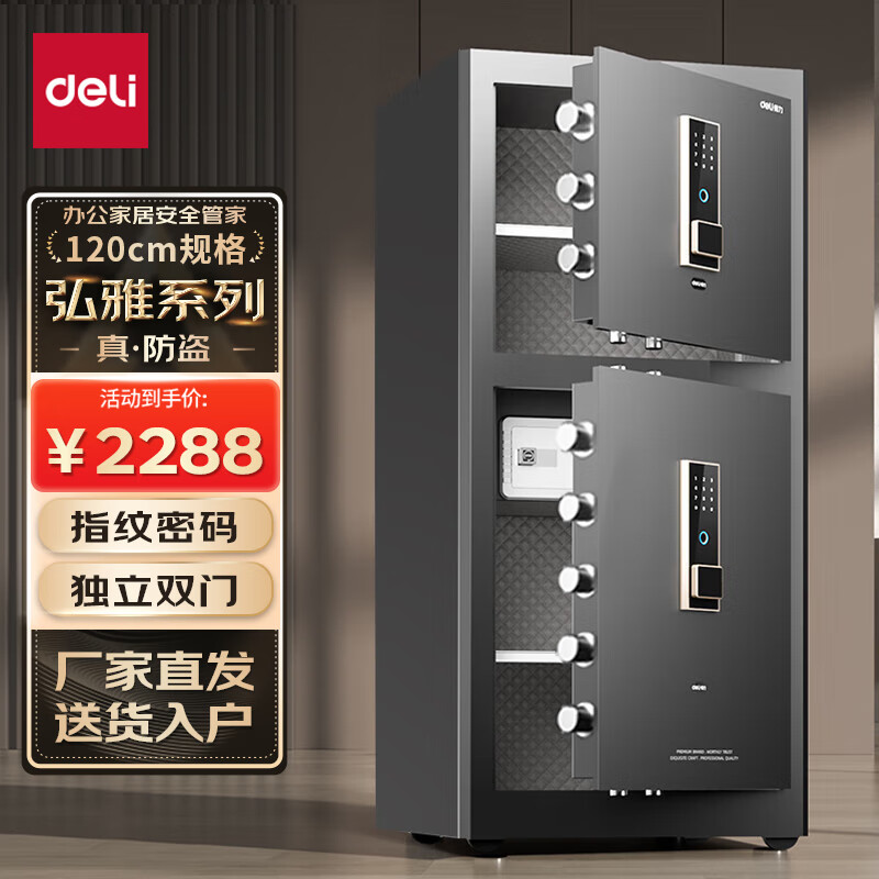 得力(deli)保险柜 高120CM双门办公家用保管箱 半导体指纹+触屏密码双重保险 科技布内饰 弘雅AE71-ZM 黑色价格:2288.00元!
