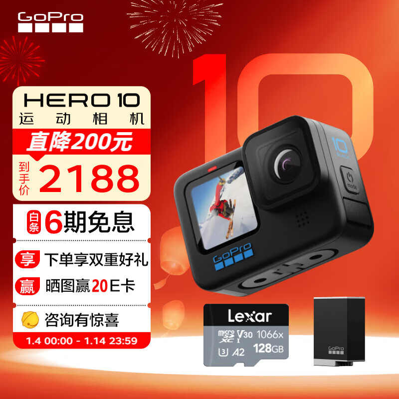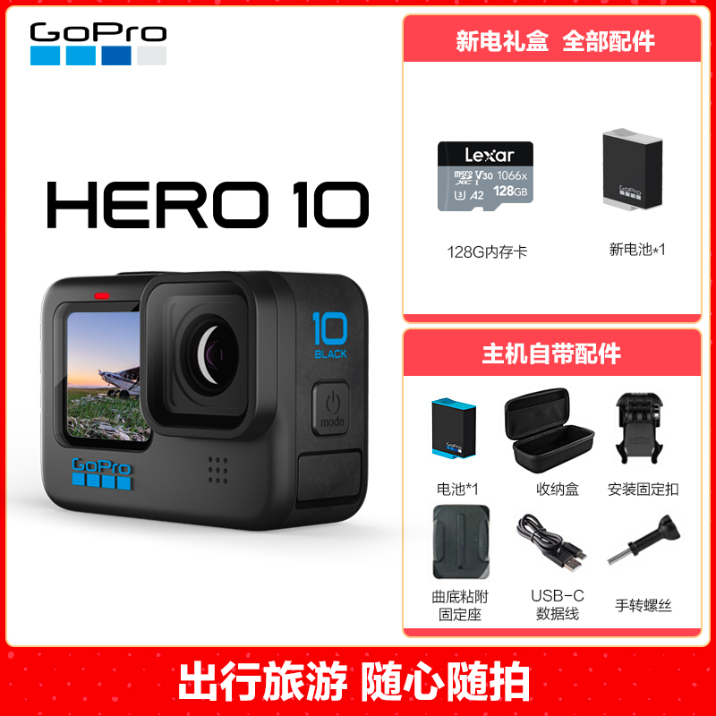 GoPro HERO10 Black运动相机 防抖防水随身Vlog相机摩托车骑行户外手持摄像机 新电礼盒 HERO 10 Black价格:2188.00元!