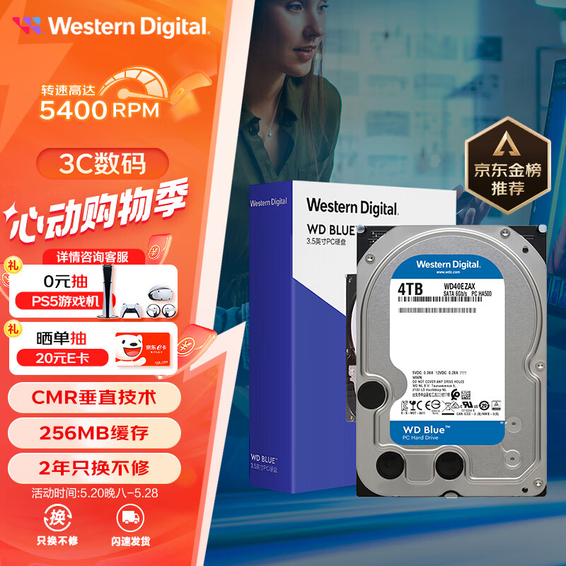 西部数据 台式机机械硬盘 WD Blue 西数蓝盘 4TB CMR垂直 5400转 256MB SATA (WD40EZAX)价格:499.00元!