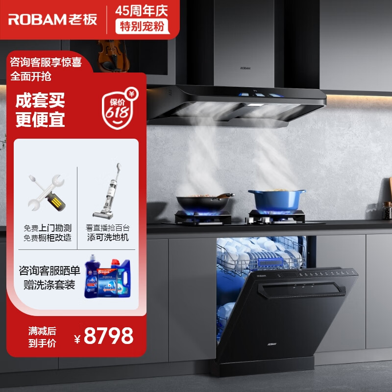 老板(Robam)钢琴家D3S智能变频 24风量抽油烟机15套洗碗机嵌入式独立式两用厨房多件套62D3S+57B6DT+F80D黑价格:9698.00元!