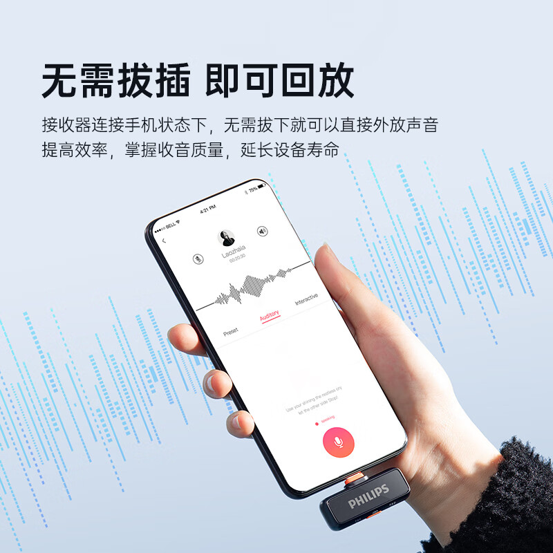 飞利浦(PHILIPS)直播麦克风无线领夹式主播手机收音直播户外Vlog短视频录音麦 Type-C版一拖二+充电仓DLM3543C价格:659.00元!