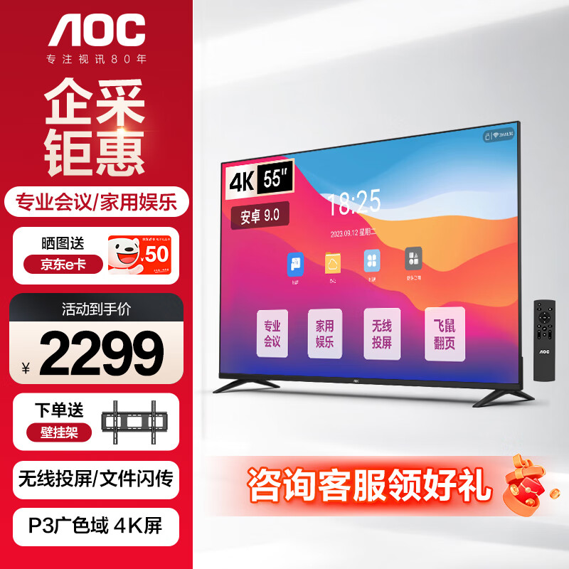 AOC会议电视4K超清会议平板一体机移动电视会议室显示屏投影投屏商用电视多媒体一体机智能显示智慧屏55英寸55NV+壁挂架+桌面支架底座价格:2399.00元!