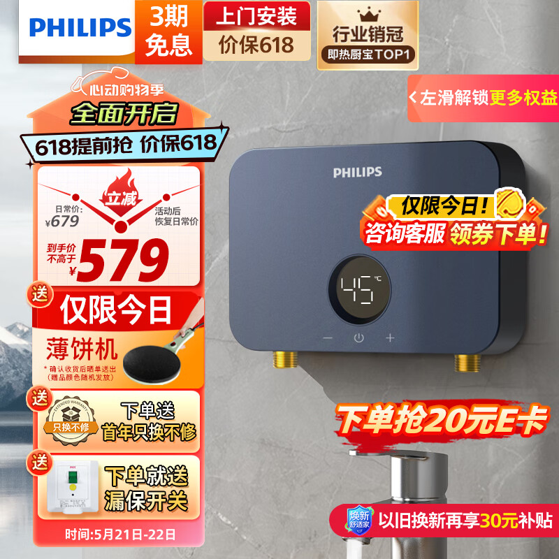 飞利浦(PHILIPS)即热式小厨宝电热水器 5500W三档变频不限水量迷你家用即开即热免储水 小尺寸AWH1053/93价格:679.00元!