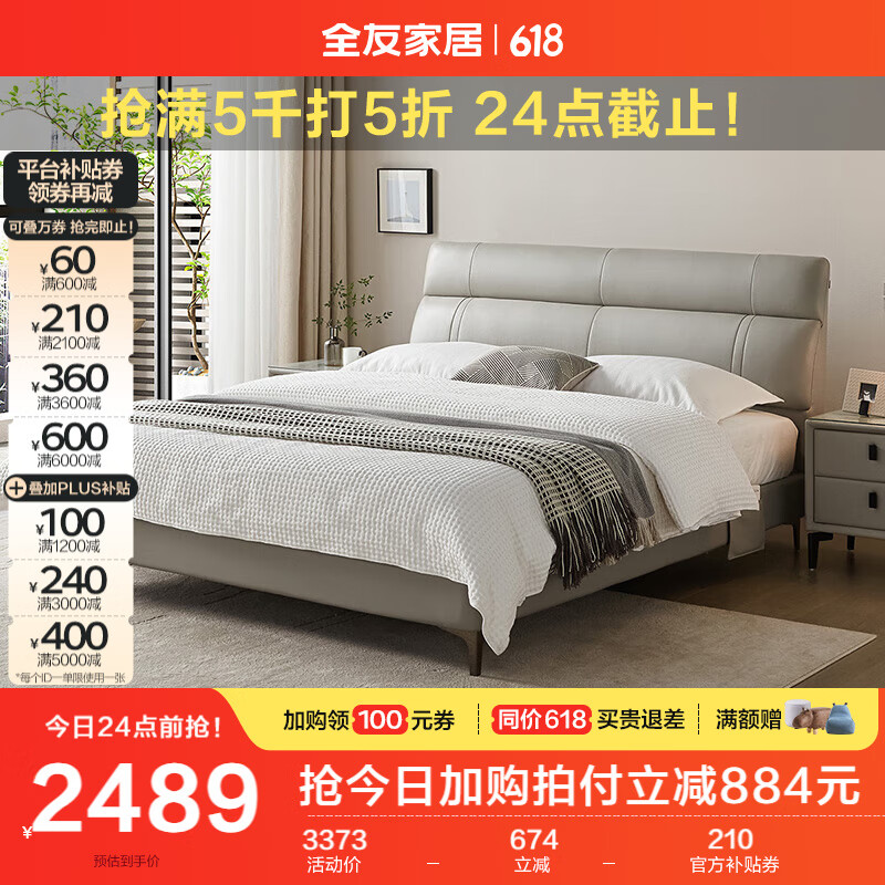 全友家居 真皮艺床 头层牛皮现代简约主卧室双人大床2米2.2米105251价格:3373.75元!