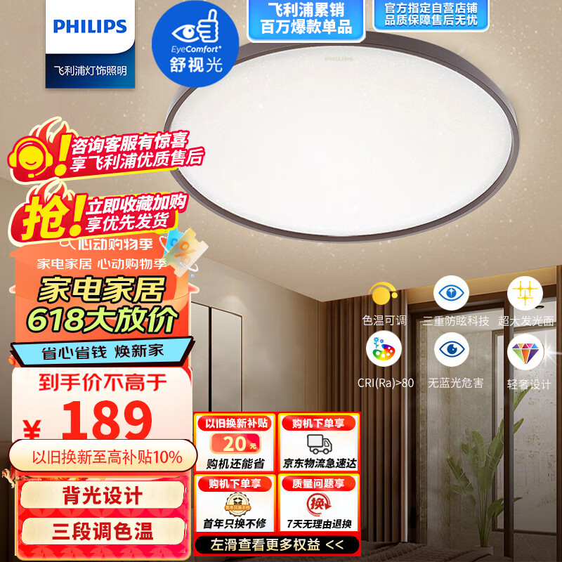 飞利浦(PHILIPS)LED调光卧室灯吸顶灯客厅灯餐厅灯圆形现代简约灯具 星环24W棕色价格:249.00元!