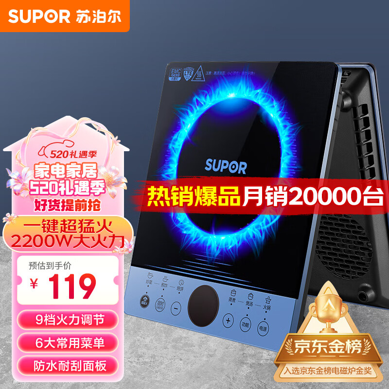 苏泊尔(SUPOR)家用大功率9档调节电磁炉 电磁灶 智能滑控 爆炒 分体式防水电磁灶 可定时 C22-IH30E9D 【单机】价格:119.00元!