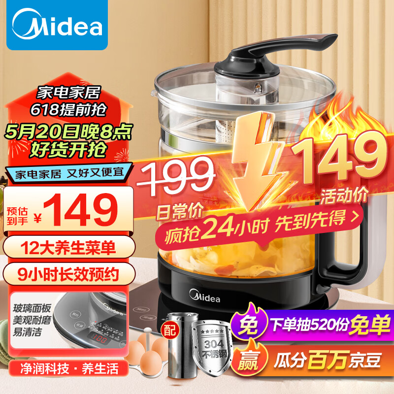 美的(Midea)养生壶 玻璃面板大口径煮茶壶 办公室宽口烧水壶 电水壶 花茶壶1.5L大容量保温煮茶器 MK-YSNC1502价格:149.00元!