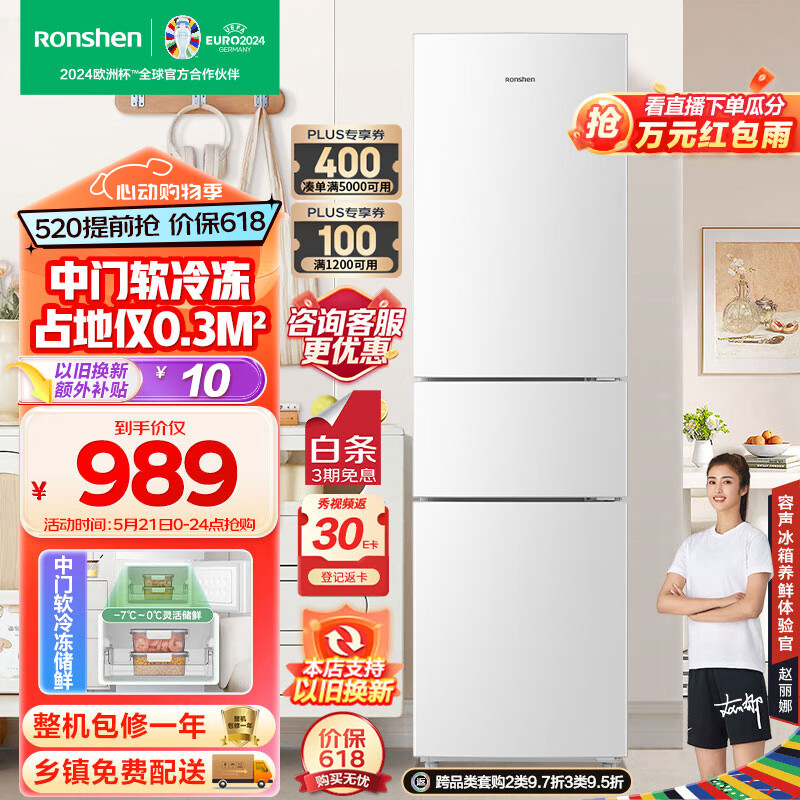 容声(Ronshen)218升三门小型电冰箱白色中门软冷冻三温区保鲜节能省电低噪家用租房宿舍小巧不占地BCD-218D11N价格:989.00元!