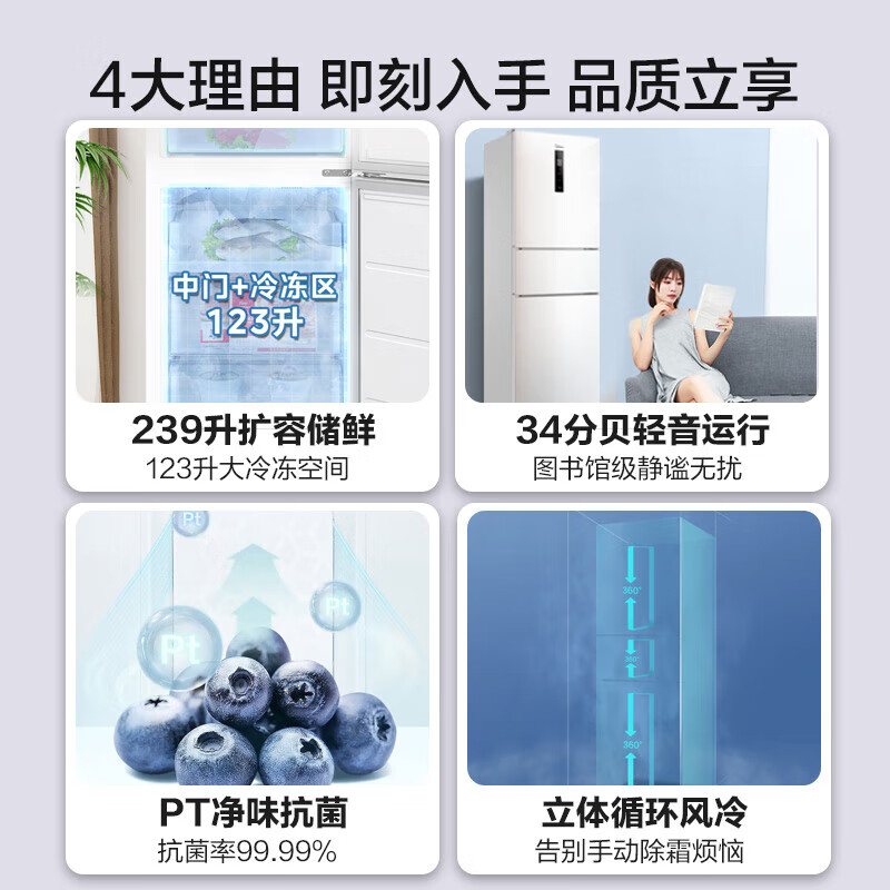 美的(Midea)251三门三开门电冰箱家用小型风冷无霜变频一级能效节能省电轻音净味保鲜宿舍租房MR-251WTPE价格:2299.00元!
