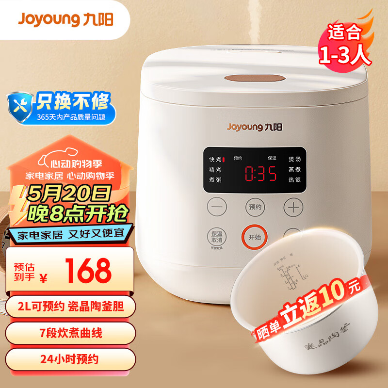 九阳电饭煲1-3人小型迷你2L家用瓷晶陶釜不粘内胆电饭锅F-20FZ125价格:168.00元!