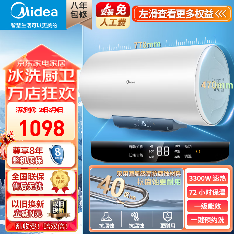 美的(Midea)【家用推荐】电热水器储水式新升级大功率速热 一级能效 72小时保温 卫生间带预约功能热水器MC5 【新升级3300w速热】80升价格:1099.00元!