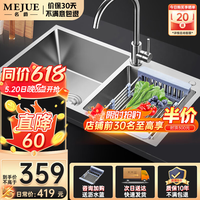 名爵(MEJUE)304不锈钢龙头手工加厚水槽洗碗池 大容量双槽洗菜盆Z-02460价格:419.00元!