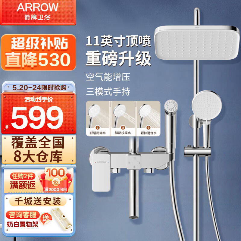 箭牌(ARROW) 淋浴花洒套装铜龙头沐浴家用浴室淋雨喷头顶喷花洒冷热淋浴喷头 【B款】巨幕增压四功能花洒3405M价格:599.00元!