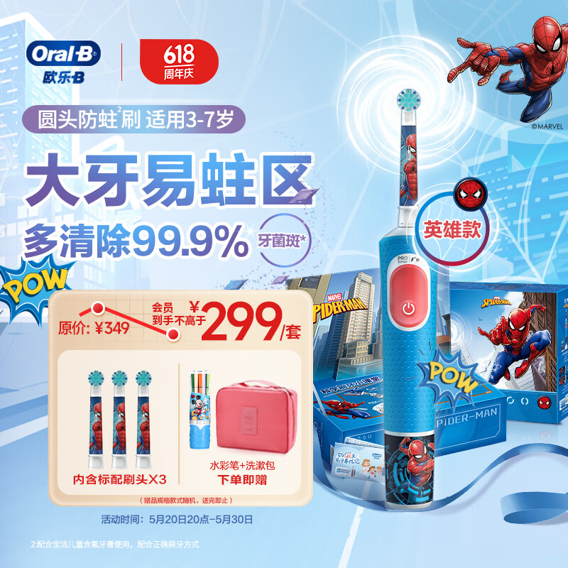 欧乐B儿童电动牙刷3-7岁乳牙期专用 D103K蜘蛛侠礼盒(含刷头*3)日常清洁 送孩子礼赠生日礼物价格:349.00元!