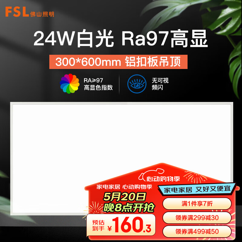 FSL佛山照明集成吊顶灯led吸顶灯平板厨卫灯Ra97显300*600白光24W价格:229.00元!