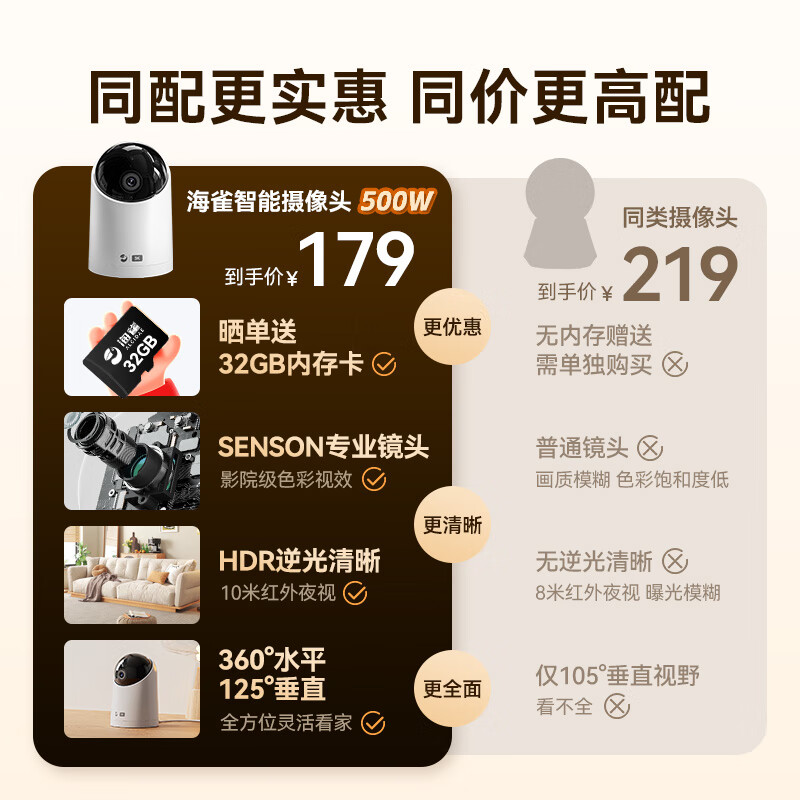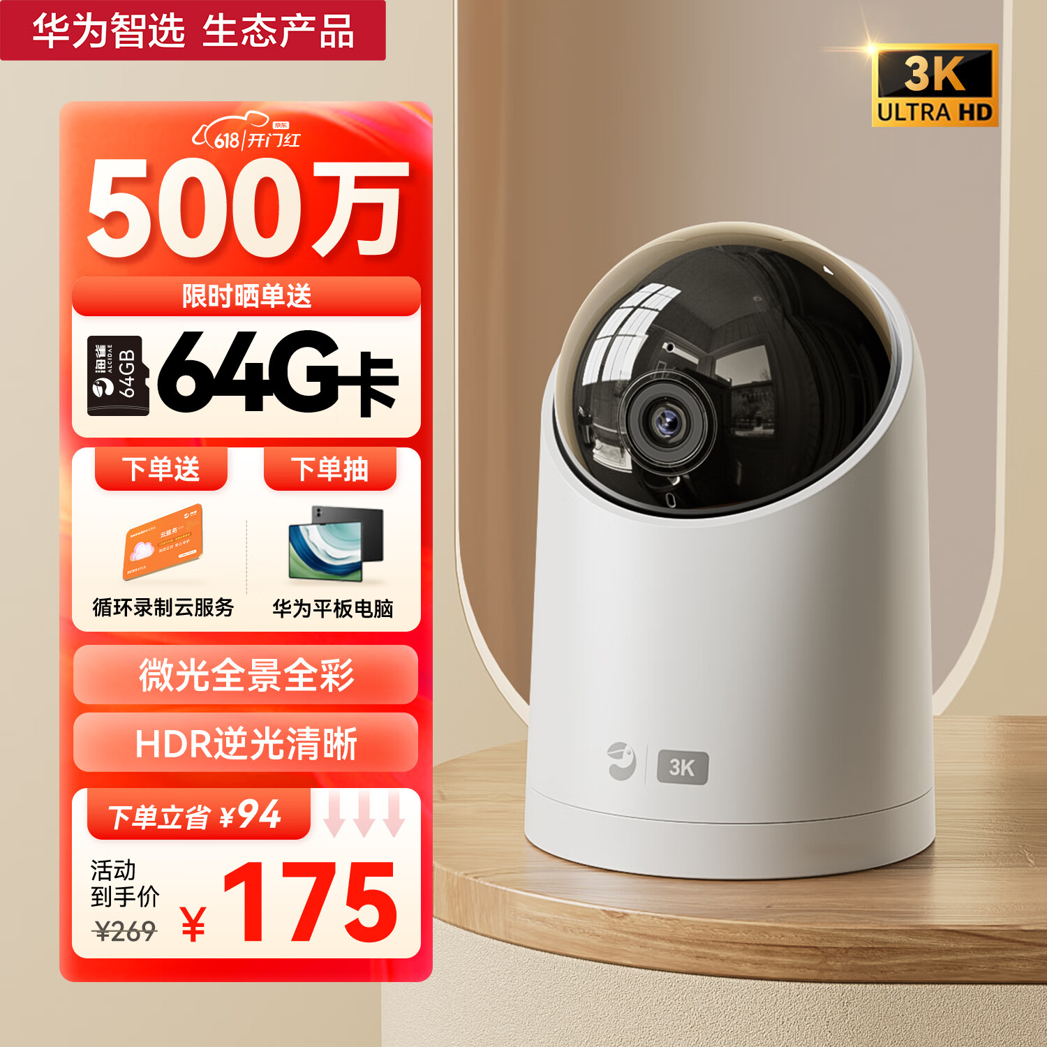 华为智选海雀500万摄像头家用监控器360度无死角带夜视全景语音手机远程超高清门口家庭室内智能看护云台3K价格:175.00元!