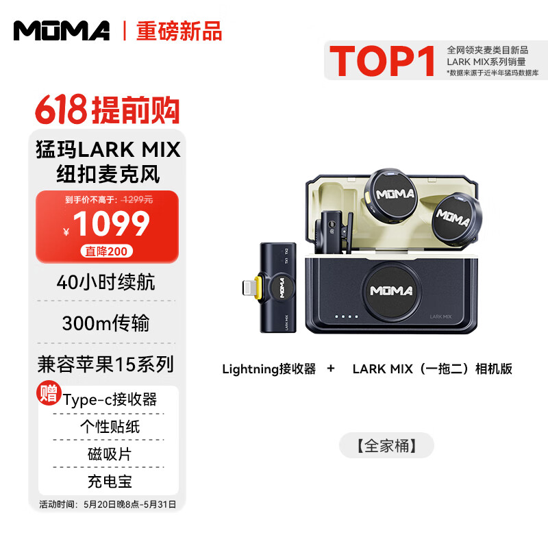 猛玛(MOMA)Lark Mix 一拖二无线领夹麦克风猛犸手机相机直播vlog户外采访微小型纽扣收音麦全家桶黑色价格:1099.00元!
