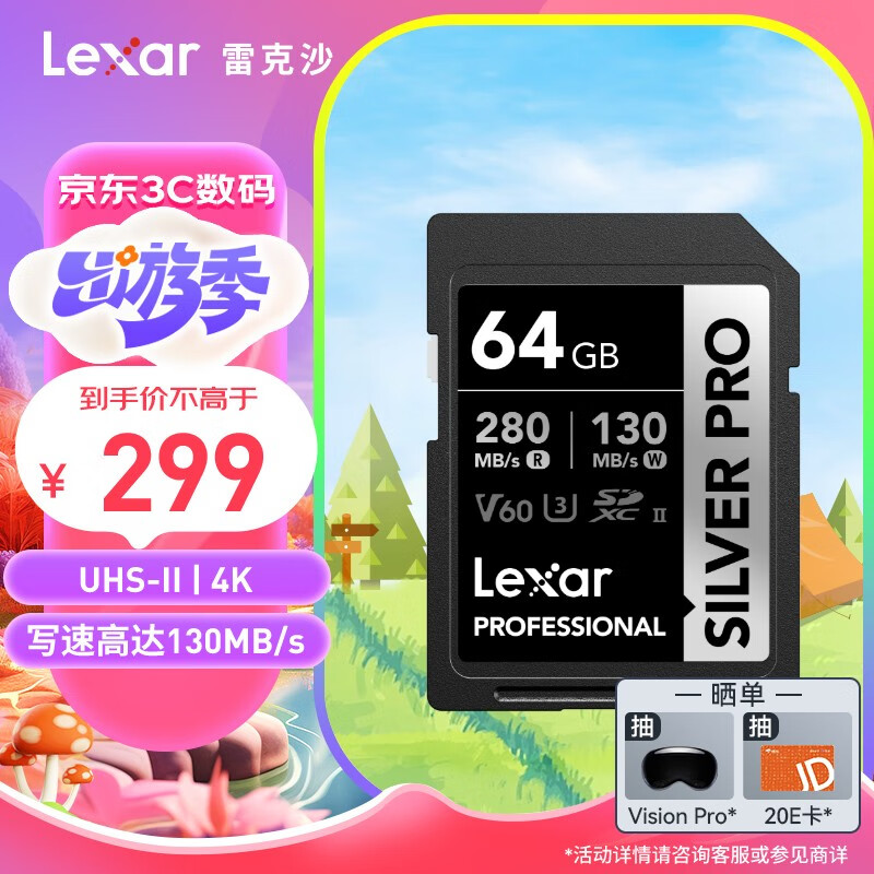 雷克沙(Lexar)64GB SD存储卡 C10 U3 V60 4K相机内存卡 读280MB/s 写130MB/s 捕捉光影(SILVER PRO)价格:299.00元!