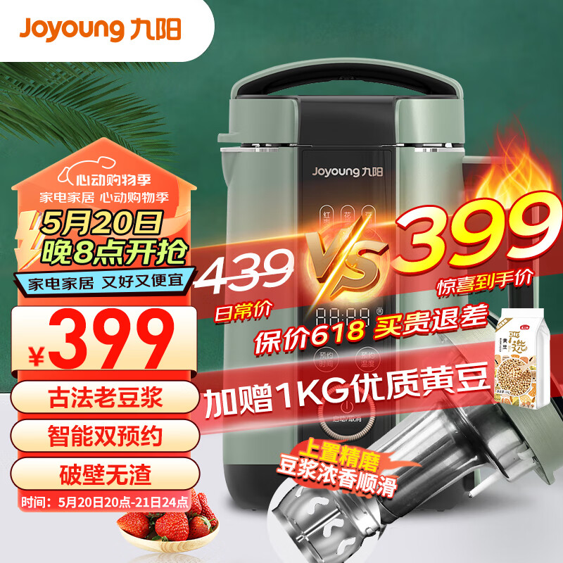 九阳(Joyoung)豆浆机1.3L 古法老豆浆 破壁免滤 创新侧屏旋控2-5人食 家用多功能可预约榨汁机料理机破壁机价格:399.00元!