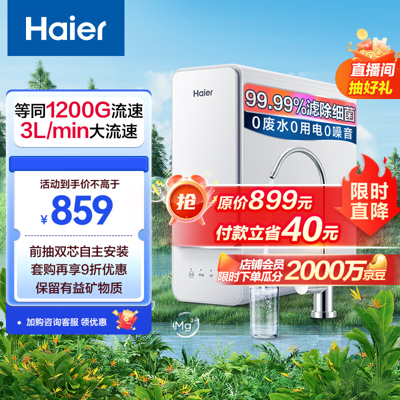 海尔(Haier)超滤净水器家用前置过滤器净水机直滤3L大流量饮用厨下式无桶厨房自主换芯过滤器白小矿价格:859.00元!