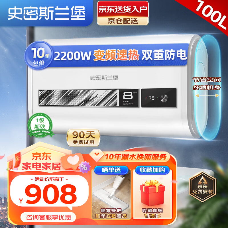 史密斯兰堡热水器电热水器100升家用洗澡沐浴超薄双胆恒温扁桶出租房卫生间宿舍公寓一级能效上门安装S-07价格:908.00元!