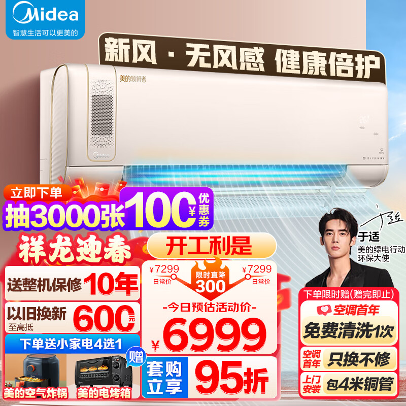 美的(Midea)领鲜者 大2匹 新一级能效变频冷暖 客厅商用 无风感新风空调挂机 KFR-50GW/BP3DN8Y-KW200(1)价格:6999.00元!