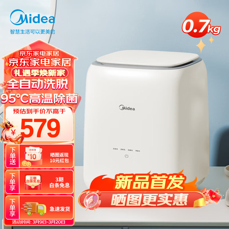 美的(Midea)全自动洗衣机家用迷你洗衣机 内衣内裤高温煮洗除菌除螨洗袜子神器洗脱一体机MNB7VH1E 【不锈钢内桶】0.7KG高温煮洗迷你洗衣机价格:599.00元!
