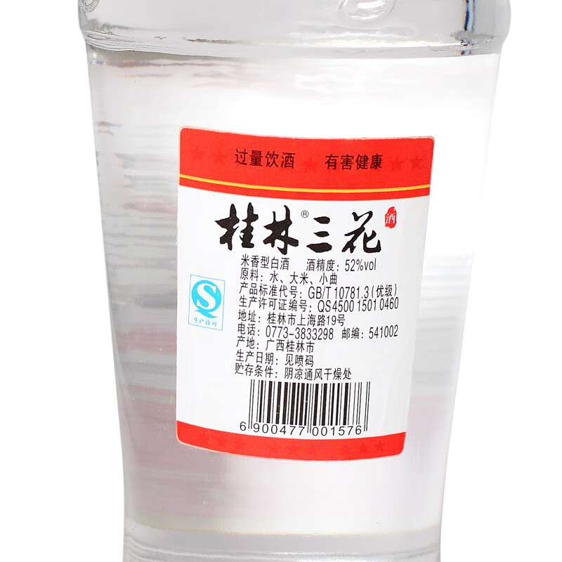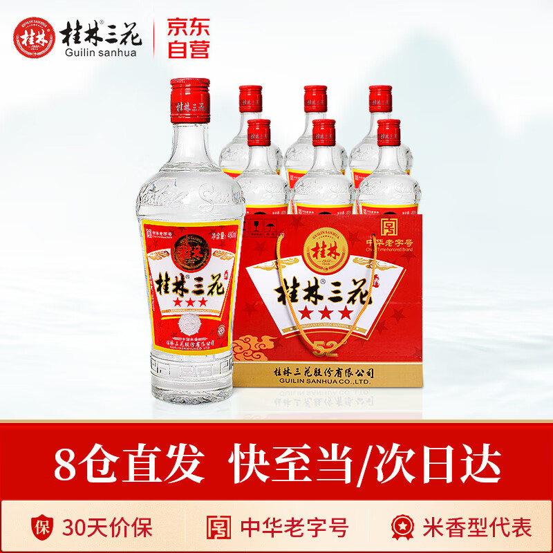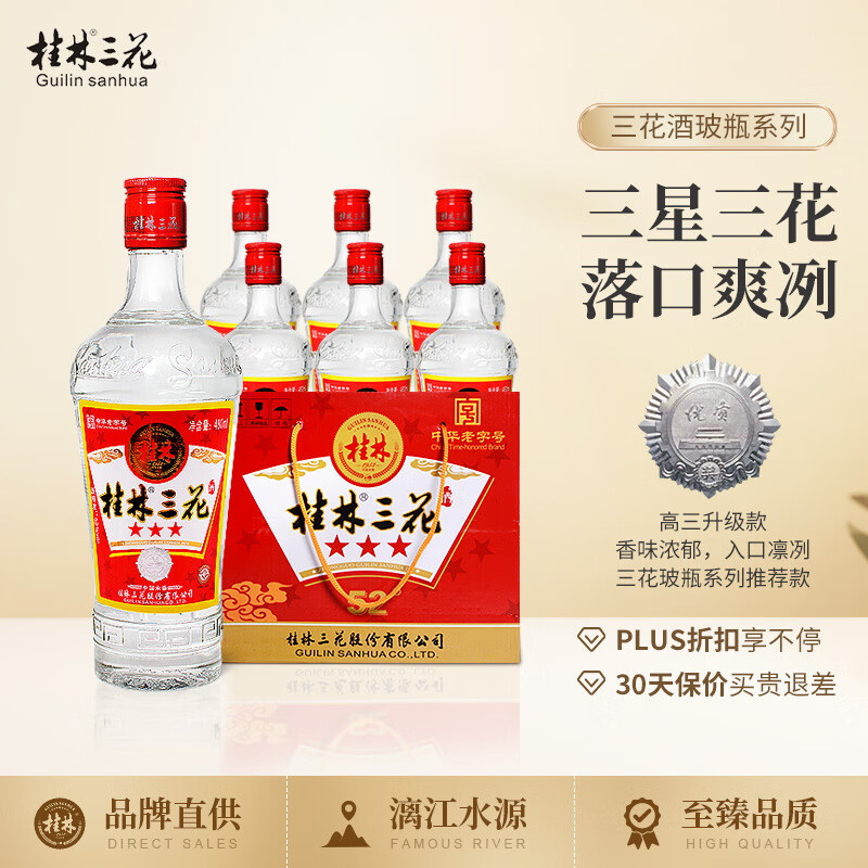 桂林三花酒 高度白酒 米香型 三星 52度 480ml*6瓶 整箱装价格:210.00元!