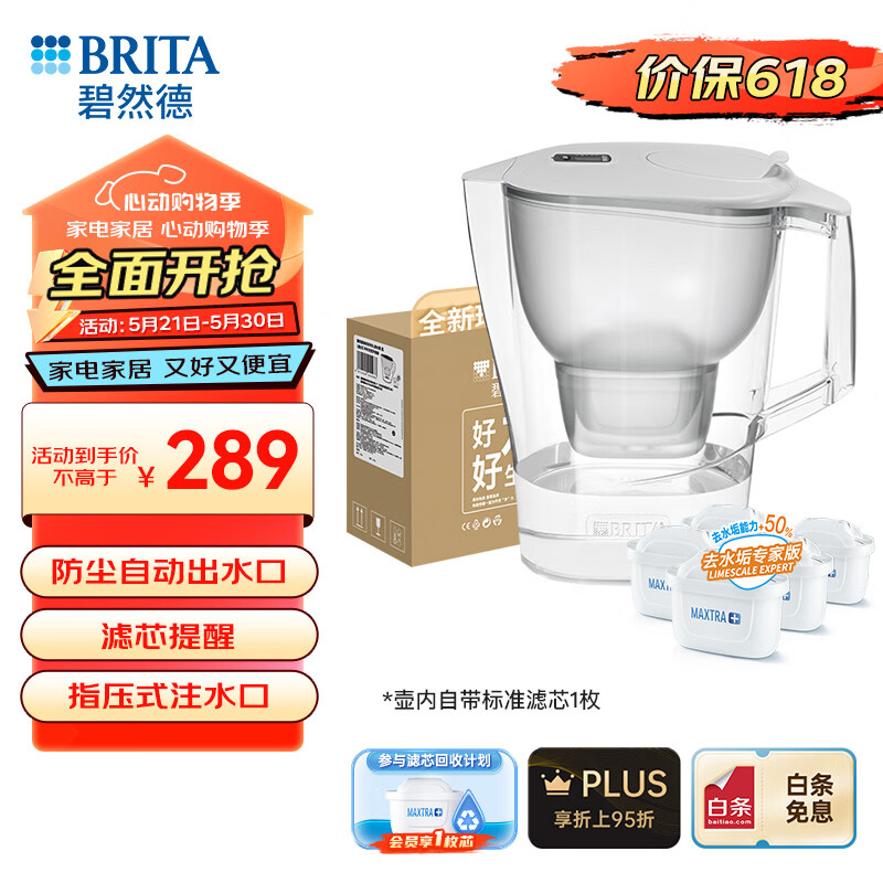 碧然德(BRITA)过滤净水器 家用滤水壶 Kalea 晨汐系列XL 3.5L(灰)+专家版滤芯5枚 环保加固包装价格:359.00元!