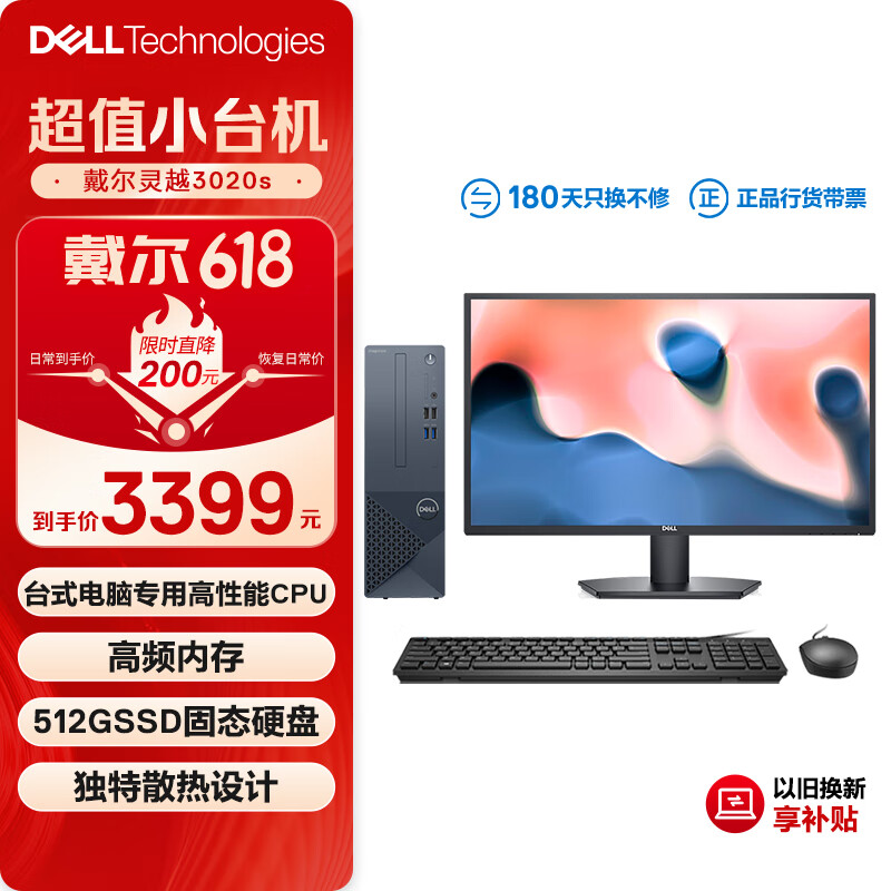 戴尔(DELL)灵越3020S 台式电脑主机 (酷睿13代i3-13100 8G 512GSSD)27英寸大屏显示器 高性能CPU价格:3399.00元!