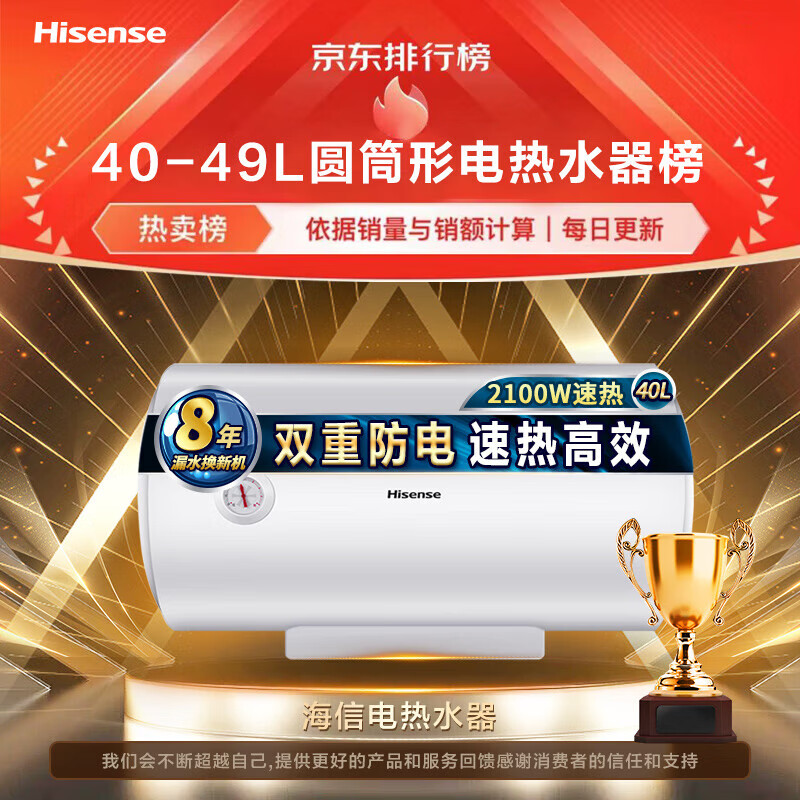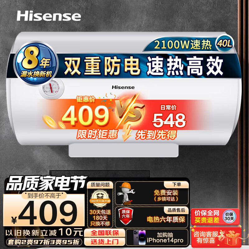 海信(Hisense)40升家用电热水器 2100W速热 加粗镁棒 操控简单 升级防电墙 双重保护DC40-W1311【以旧换新】价格:409.00元!
