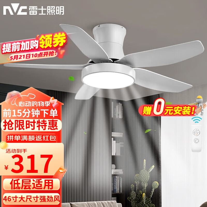 雷士(NVC)风扇灯开叶吊扇灯北欧现代客厅餐厅变频电机遥控三色光46寸大尺寸价格:564.00元!