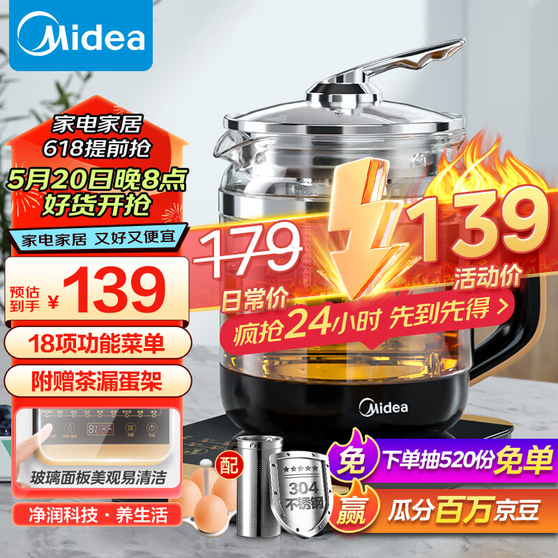 美的(Midea)养生壶 大口径煮茶壶 18项功能电热水壶 多段控温恒温 玻璃面板烧水壶1.5L大容量附带蛋架WGE1703b价格:139.00元!
