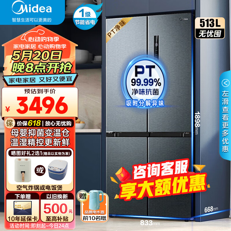 美的(Midea)冰箱513升十字对开门四门冰箱 一级能效 双变频 风冷无霜 家用大容量四门BCD-513WTPZM(E)价格:3696.00元!