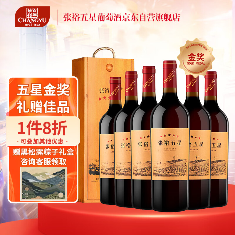 张裕(CHANGYU)五星金奖赤霞珠干红葡萄酒750ml*6瓶整箱礼盒装 国产红酒价格:1788.00元!