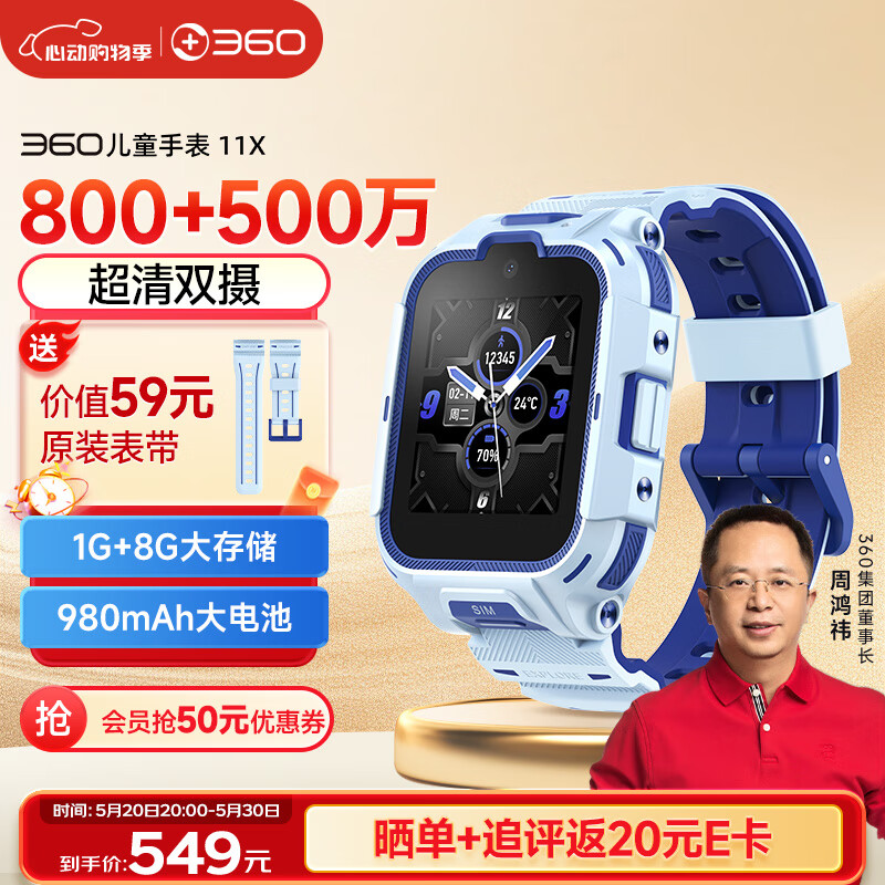 360【周鸿祎直播】儿童电话手表11X 高清双摄儿童定位手表超长续航4G通视频通话手表男女孩跃动蓝价格:549.00元!