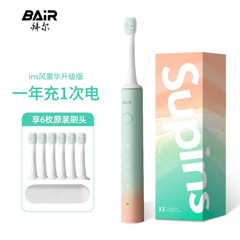 拜尔(BAIR) X3电动牙刷成人充电式智能声波情侣全自动充电牙刷男士女学生党 送男女朋友 海洋蓝【豪华6刷头升级版】价格:208.00元!