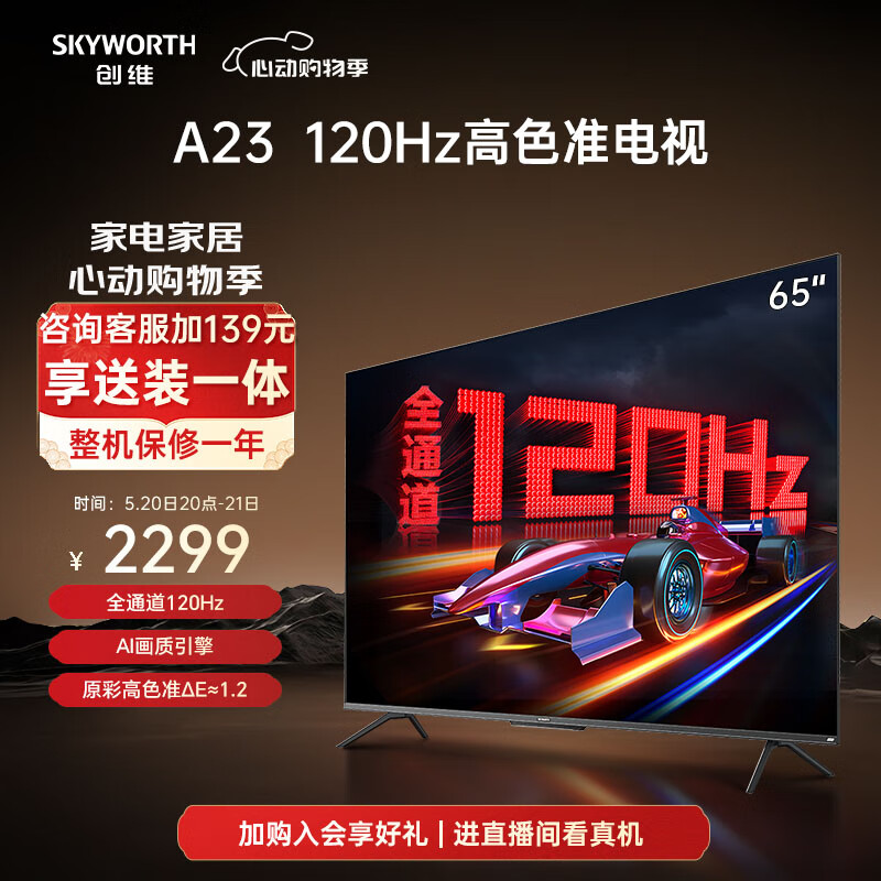 创维电视65A23 65英寸电视机全通道120Hz 2+32G4K超高清护眼声控屏智能液晶价格:2399.00元!