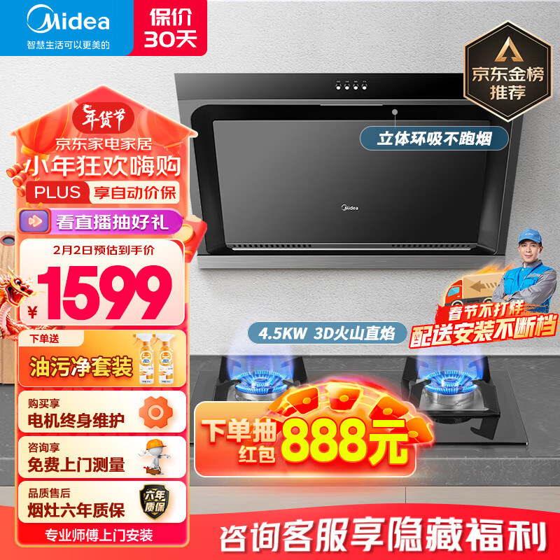 美的(Midea)侧吸式家用抽油烟机 燃气灶具烟灶套装 多重油烟分离技术 立体环吸J30+Q217A天然气价格:1599.00元!