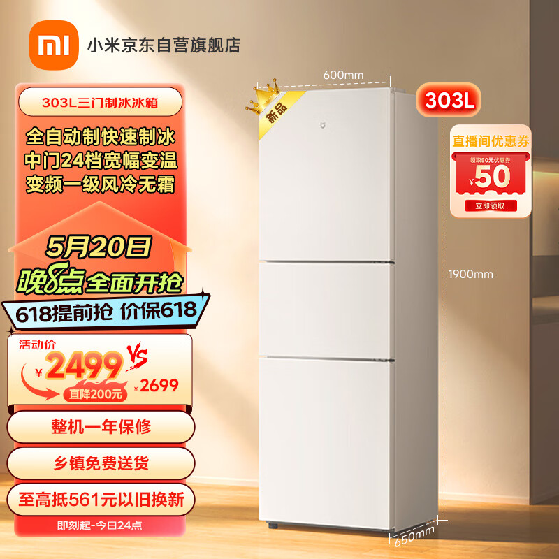 米家小米303L三门精巧装全自动制冰冰箱小型 冰羽白磨砂面板极简百搭风冷无霜一级能效BCD-303WMSA价格:2499.00元!