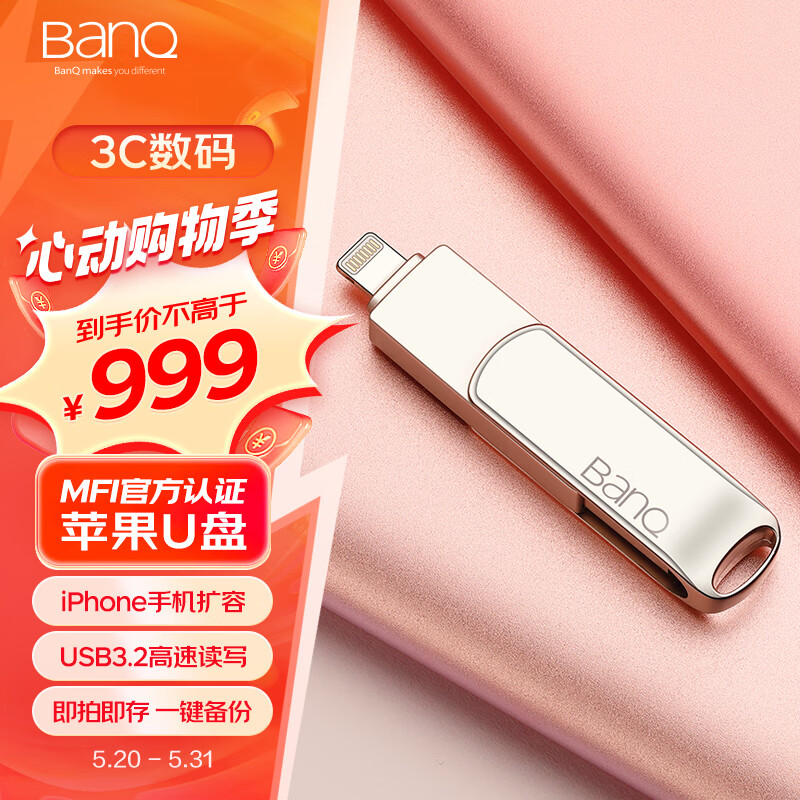 banq 1TB Lightning USB3.0苹果U盘 A50高速苹果MFI授权认证 iPhone/iPad双接口手机电脑两用U盘价格:999.00元!